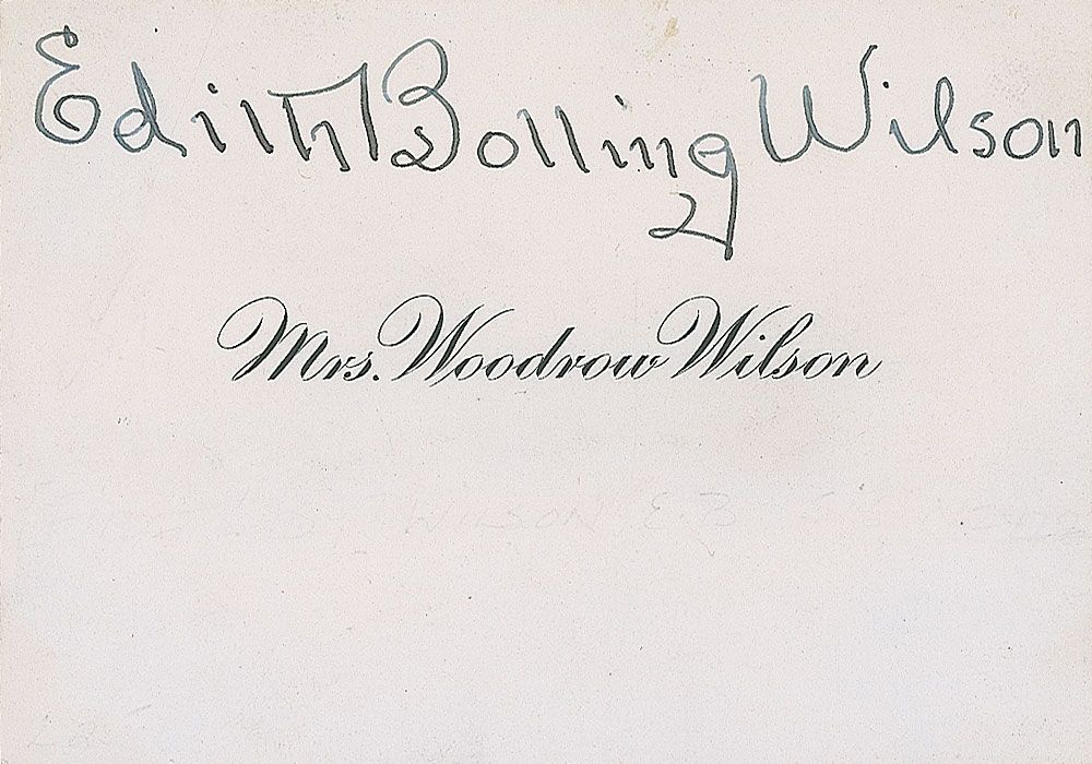 Original personal calling card bearing Wilson’s name, 3.25 x 2.25, signed at the top in black ink, “Edith Bolling Wilson.” In fine condition, with a slight bend to the front and light mounting remnants to the reverse.