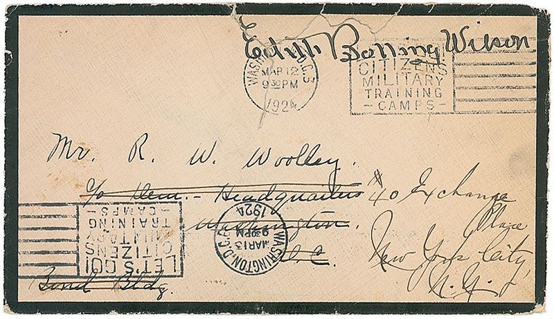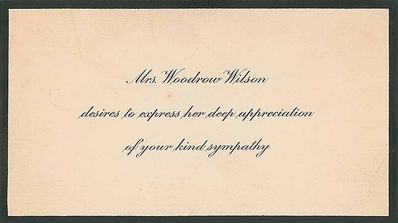Free franked black-bordered mailing envelope, 6 x 3.25, addressed in another hand to “Mr. R. W. Woolley,” and franked in the upper right, “Edith Bolling Wilson.” Postmarked March 12, 1924, about five weeks after Woodrow Wilson’s death. In very good condition, with tears from opening and the postmark affecting the signature. Accompanied by the originally enclosed mourning card from Wilson, expressing appreciation for condolences offered by the recipient.