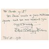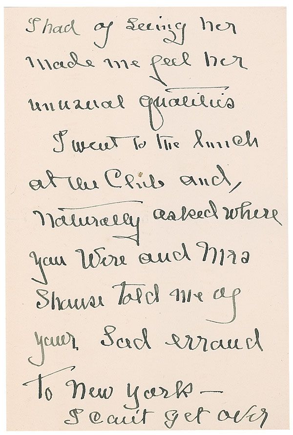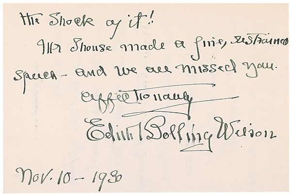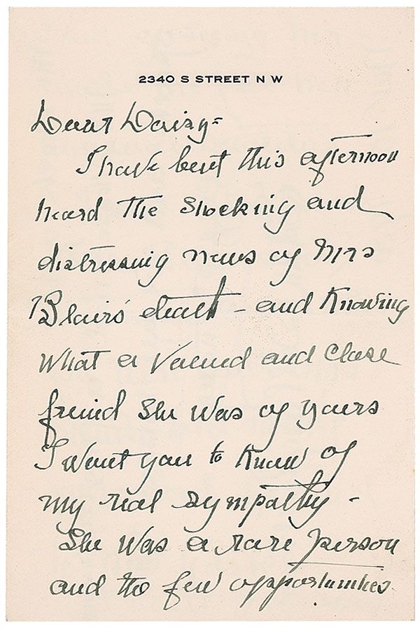 ALS, three pages on two adjoining sheets, 4.25 x 6.25, personal letterhead, November 10, 1930. Letter offering condolences. In part: “Knowing what a valued and close friend she was of yours I want you to know of my real sympathy.” In fine condition.