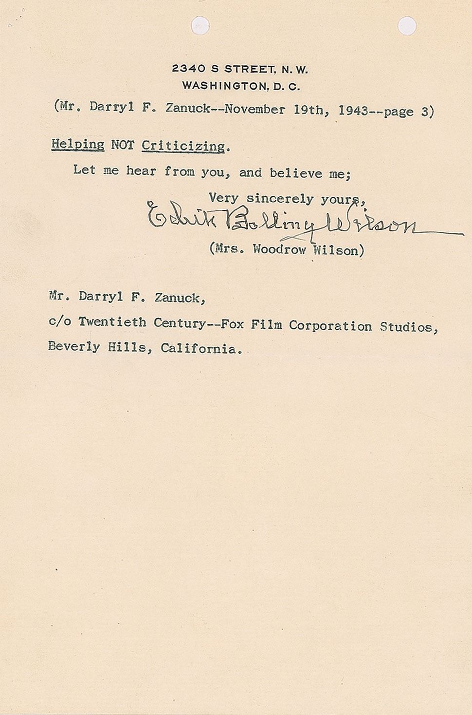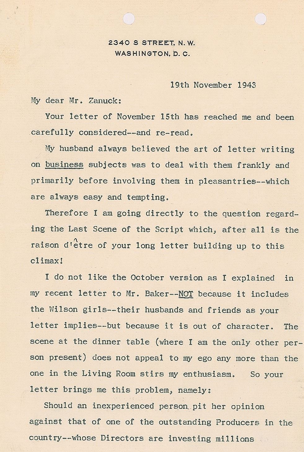 World War II-dated TLS, three pages, 6.25 x 9.5, November 19, 1943. Letter to Oscar-winning film executive Darryl F. Zanuck, regarding the screenplay for the forthcoming biopic about her late husband, in part: "My husband always believed the art of letter writing on business subjects was to deal with them frankly and primarily before involving them in pleasantries—which are always easy and tempting. Therefore I am going directly to the question regarding the Last Scene of the Script which, after all is the raison d'etre of your long letter building up to this climax! I do not like the October version as I explained in my recent letter to Mr. Baker—NOT because it includes the Wilson girls—their husbands and friends as your letter implies—but because it is out of character. The scene at the dinner table (where I am the only other person present) does not appeal to my ego any more than the one in the Living Room stirs my enthusiasm. So your letter brings me this problem, namely: