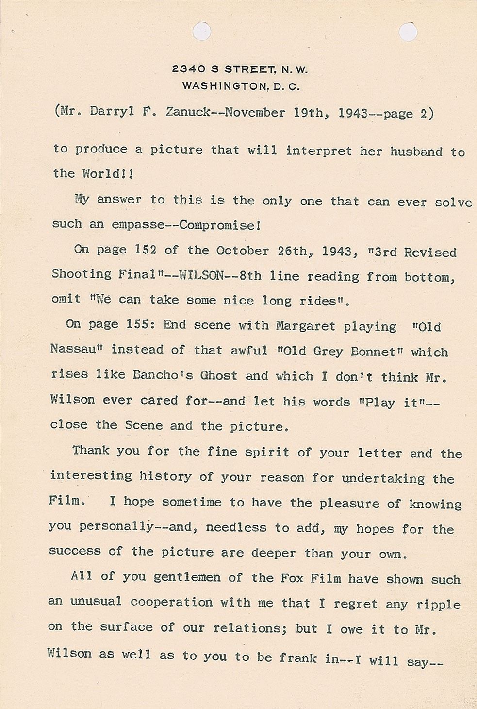 Should an inexperienced person pit her opinion against that of one of the outstanding Producers in the country—whose Directors are investing millions to produce a picture that will interpret her husband to the World!! My answer to this is the only one that can ever solve such an empasse—Compromise! On page 152 of the October 26th, 1943, '3rd Revised Shooting Final'—WILSON—8th line reading from bottom, omit 'We can take some nice long rides.' On page 155: End scene with Margaret playing 'Old Nassau' instead of that awful 'Old Grey Bonnet' which rises like Bancho's Ghost and which I don't think Mr. Wilson ever cared for—and let his words 'Play it'—close the Scene and the picture.
