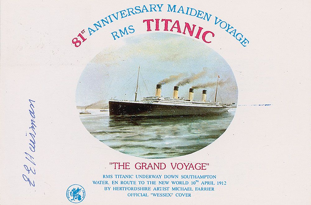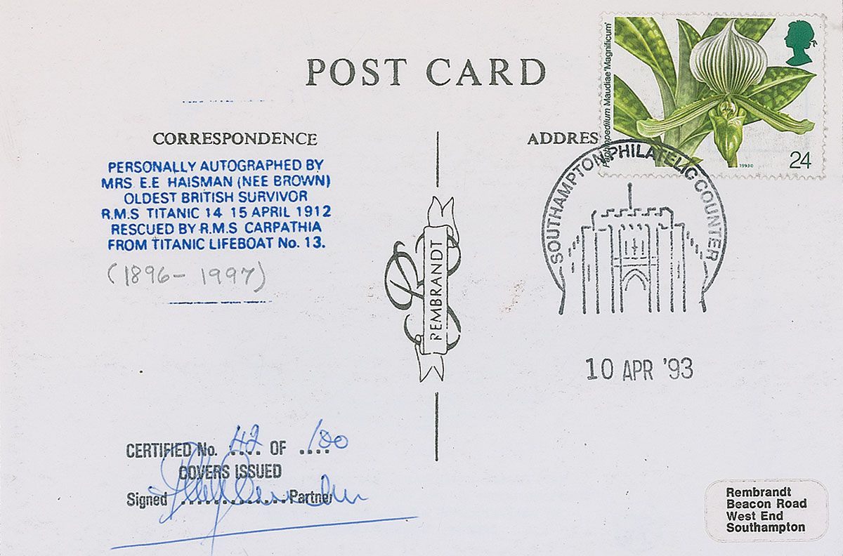 South African student (1896-1997) who survived the Titanic’s sinking with her mother, but lost her father in the disaster. Limited edition color postcard, 6 x 4, celebrating the 81st anniversary of the Titanic’s maiden voyage, 42/100, signed vertically on the front in blue ballpoint, “E. E. Haisman.” Reverse bears a certification stamp and an April 10, 1993 cancellation. In fine condition. Ex. Brian Green Collection.