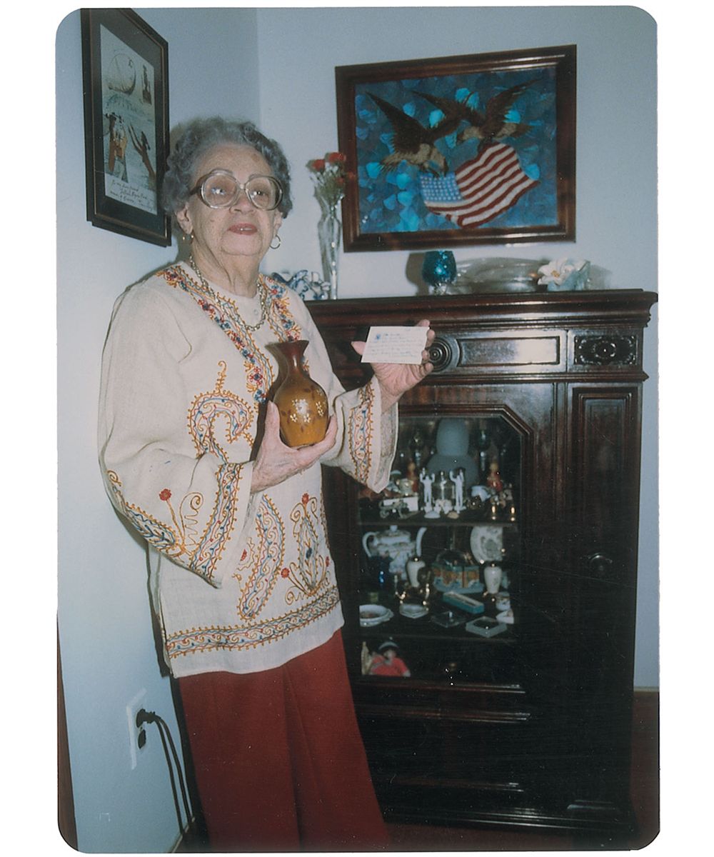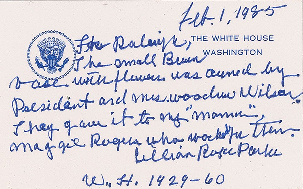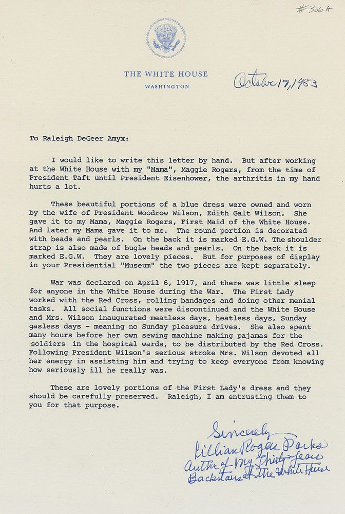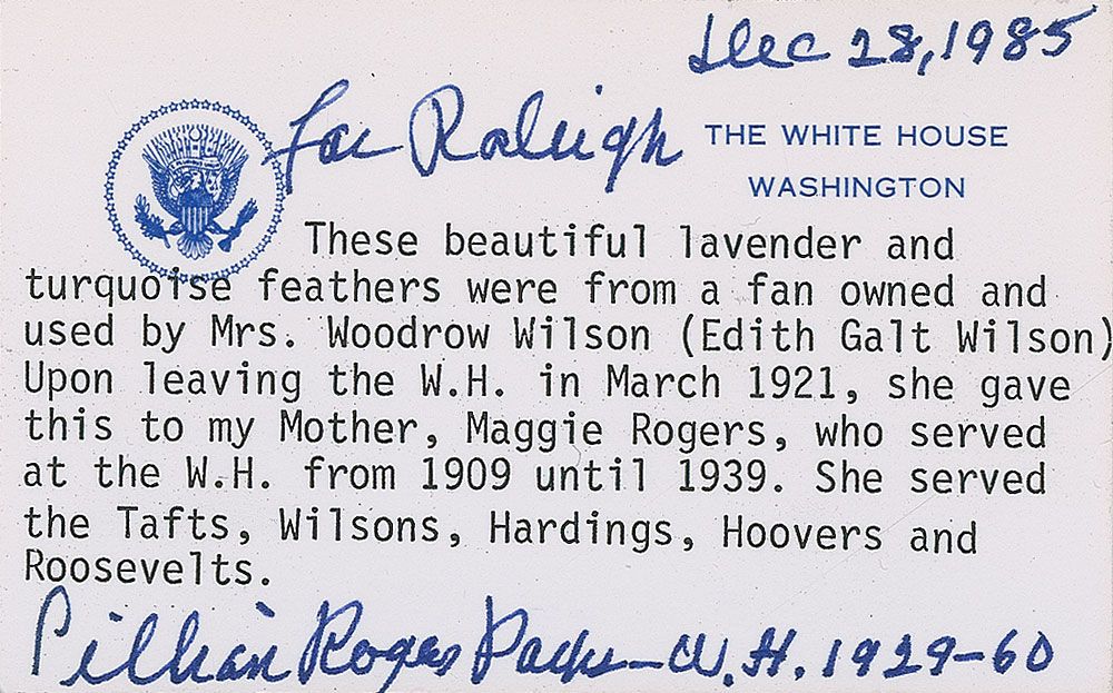Collection of five items, all personally-owned by First Lady Edith Wilson: two beautiful large sections of beaded blue velvet fabric from a dress personally-owned and -worn by Edith Galt Wilson; lavender and turquoise feathers from a fan personally-owned and -used by Edith Wilson; a small brown vase personally-owned by the President and Mrs. Wilson; and a blue rayon beaded belt personally-owned and -worn by Edith Wilson. Includes detailed letters of provenance on White House letterhead from Lillian Rogers Parks, who was a best selling author as well as housekeeper and seamstress at the White House for over 30 years, from President Hoover through President Eisenhower. In overall fine condition.
