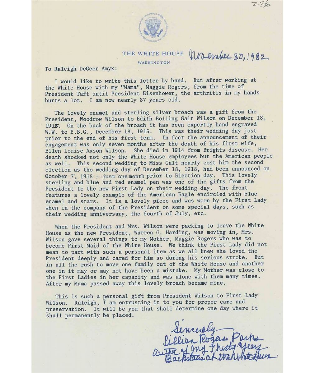 Edith Bolling Galt Wilson’s personally-owned and -worn brooch, given to her by her husband, President Woodrow Wilson, on their wedding day. Enamel and sterling silver brooch measures 2.25? wide, with a large eagle in the center with a red, white, and blue shield, all encircled with blue enamel and stars. Reverse is expertly hand-engraved, “W. W. to E. B. G, December 18, 1915.” Accompanied by a 1982 letter of provenance, on White House letterhead, by Lillian Rogers Parks, who was a best selling author as well as housekeeper and seamstress at the White House for over 30 years, from President Hoover through President Eisenhower. Letter reads, in part: “The lovely enamel and sterling silver broach [sic] was a gift from President Woodrow Wilson to Edith Bolling Galt Wilson on December 18, 1915…This was their wedding day just prior to the end of his first term…This lovely sterling and blue and red enamel pen [sic] was one of the gifts from the President to the new First Lady on their wedding day…It is a lovely piece and was worn by the First Lady when in the company of the President on some special days…When the President and Mrs. Wilson were packing to leave the White House…Mrs. Wilson gave several things to my mother, Maggie Rogers, who was to become the First Maid of the White House [often placing her in close proximity to our nation’s first families]. We think the First Lady did not mean to part with such a personal item…But in all the rush to move one family out of the White House and another one in it may or may not have been a mistake.” In fine condition.
