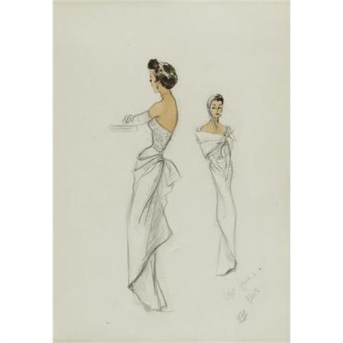 <B>Edith Head Costume Sketch.</B></I> A 12" x 18" color costume sketch for an unknown production drawn by costume designer extraordinaire Edith Head and initialed by her in pencil. During her 55-year career, Head worked on more than 400 productions -- including <I>Vertigo,</B></I> <I>Breakfast at Tiffany's,</B></I> and -<I>Sunset Blvd.</B></I> -- and received 34 Oscar nominations, winning eight of them (more than any other women in history). In Excellent condition, framed to an overall size of 18.5" x 24". <I>From the collection of John Strangi.</B></I> <I>Accompanied by a COA from JulienEntertainment.com.</B></I><BR><BR><b>Shipping:</b> Framed - with Glass, Medium (<a target="_blank" href="http://www.heritageauctions.com/common/shipping.php">view shipping information</a>)