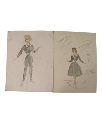Legendary costume designer Edith Head garnered 35 Oscar nominations and 8 awards, making her the most honored designer in Academy Award history. Here are two original Edith Head design drawings created for one of her most beloved clients Lucille Ball for "The Lucy Show". One of the designs has her own "optional" drawings along with special instructions in her own handwriting which read: "without the white color as mentioned on page 42 of the script". Each color, ink and pencil drawing is drafted on hard stock. (Measures approx. 14" x 11")