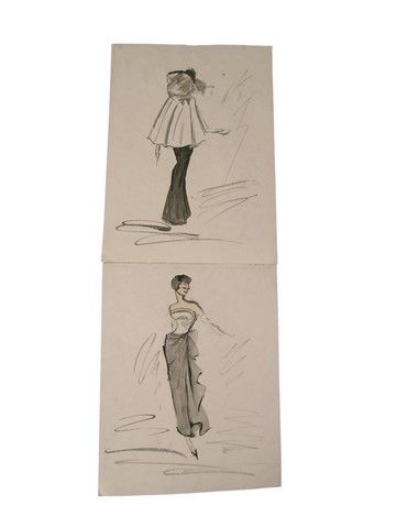 Unique original design drawings from the most honored costume designer in movie/TV history: Edith Head. These beautifully realized period gowns were created for Lucille Ball's "The Lucy Show". (Approx. 14" X11")