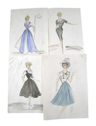 Four original costume design sketches drawn by Edith Head for The Lucy Show (1962-1968) starring Lucille Ball. On sketch paper, drawn with water color and charcoal. (approx. 17" x 12")