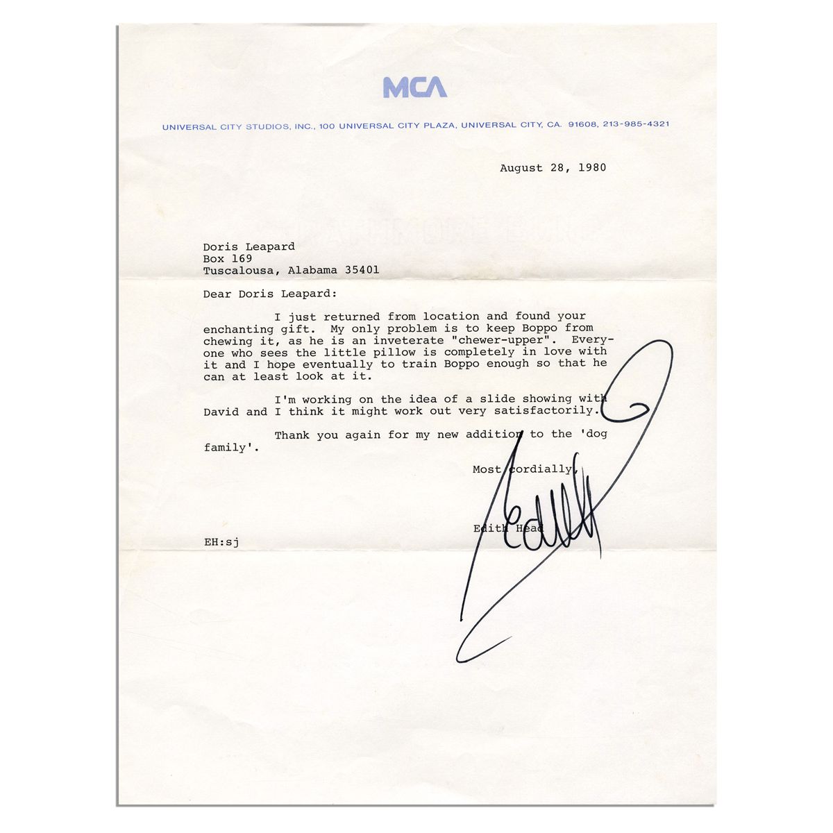 Edith Head typed letter signed, dated 28 August 1980 on MCA letterhead. The eight-time Academy Award winning costume designer writes to Doris Leapard in Tuscaloosa, Alabama, to thank her for a gift for Head's dog, Boppo. The letter reads in part, ''…I just returned from location and found your enchanting gift…Everyone who sees the little pillow is completely in love with it…'' She signs with a flourish, ''Edith''. Near fine.