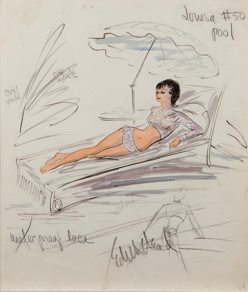 (20th Century-Fox, 1964) Pencil, pen & ink, watercolor, and gouache on 14 x 17” illustration paper, executed and very boldly signed by Edith Head(something of a rarity as much of her work went unsigned). Subject is a brief, poolside lounging outfit for Shirley MacLaine in What a Way to Go! Included is a color Xerox facsimile in miniature of a lobby card from the film of MacLaine wearing this costume. Staple holes at top margin and some soiling from handling , generally Fine.