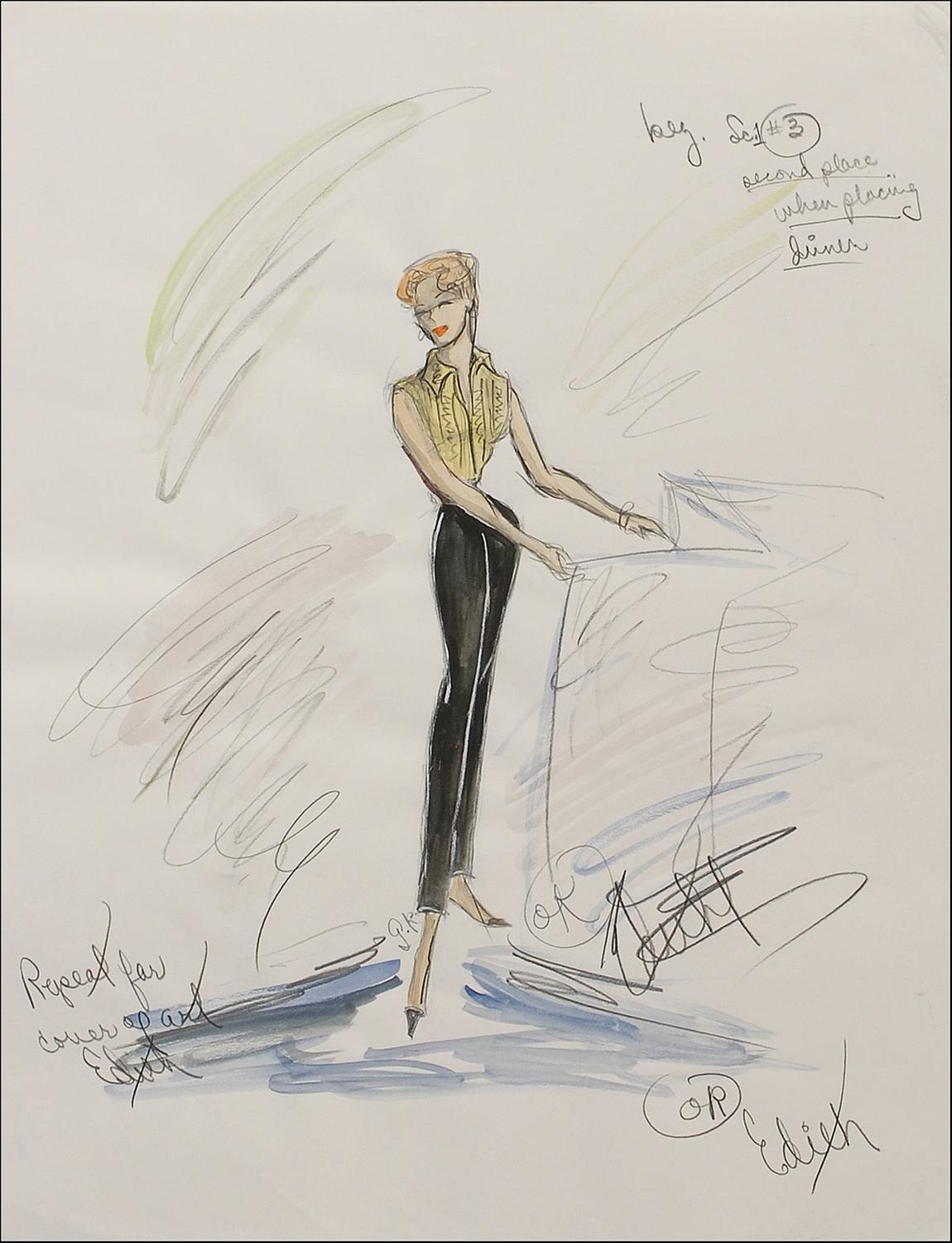 Original pencil and watercolor costume sketch supposedly of Tippi Hedren, in a beige top and black slacks an off-white 13.25 x 17 sheet. The full-length sketch is headed at the top by the famed designer, “beg. Sc. #3, second place when placing dinner” and signed twice at the bottom, “Repeat for cover of art, Edith,” and “OK, Edith.” In fine condition, with scattered light creasing, expected light rippling from watercolor, and a bit of light soiling.