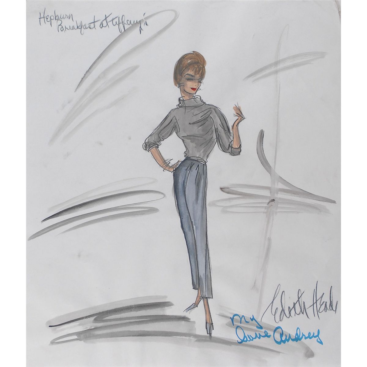Outstanding original pencil and watercolor costume sketch of Audrey Hepburn in her role as Holly Golightly in Breakfast at Tiffany’s on a 13.25 x 15.5 sheet of sketch paper. The full-length sketch shows the character in a gray top and blue slacks and is signed in artist’s pencil at the lower right corner, “Edith Head,” and notated near the top, “Hepburn, Breakfast at Tiffany’s.” Sketch is also notated in blue felt tip, “My love Audrey,” in an unknown hand. In fine condition.