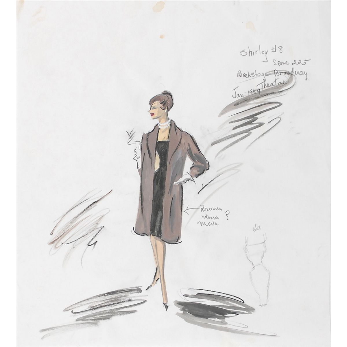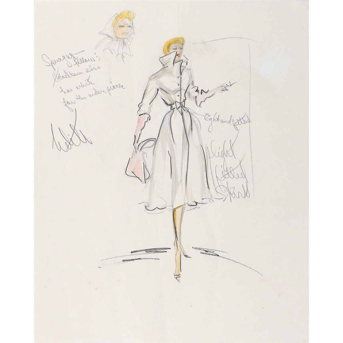 Two original ink and watercolor costume sketches on individual off-white sheets. The first is for Tippi Hedren’s role in the Hitchcock classic The Birds, and is notated by Head in pencil and signed “Edith”; and the second, notated in another hand, features Head’s sketches for Shirley MacLaine’s role in the film Career, for which Head won the Best Costume Design Academy Award. In fine condition, with a bit of scattered light soiling.