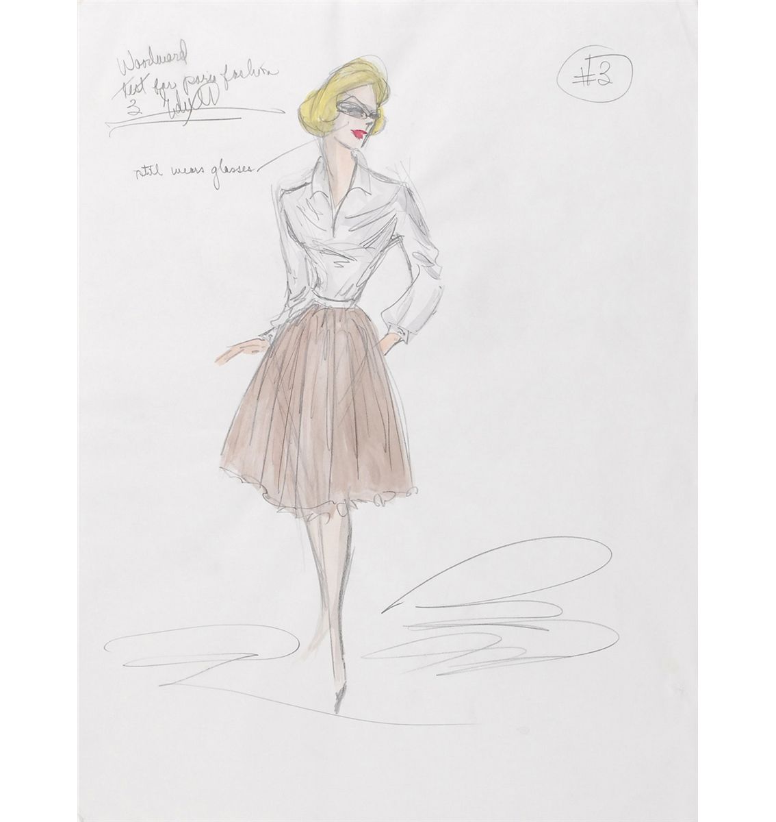 Original pencil and watercolor costume sketch of Joanne Woodward in a white top and beige skirt for her role in A New Kind of Love on an off-white 12.75 x 17 sheet. The full-length sketch is signed in artist’s pencil at the top, “Edith.” Head has also notated the sketch, “Woodward Test for Paris fashion 3, still wears glasses.” In fine condition, with some scattered light creases and a small tack hole to lower right edge.