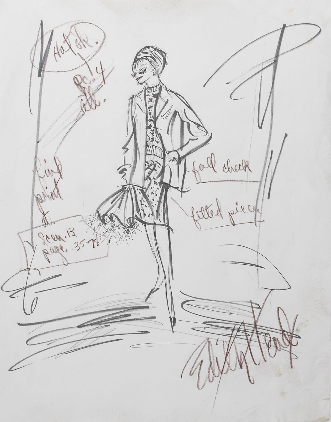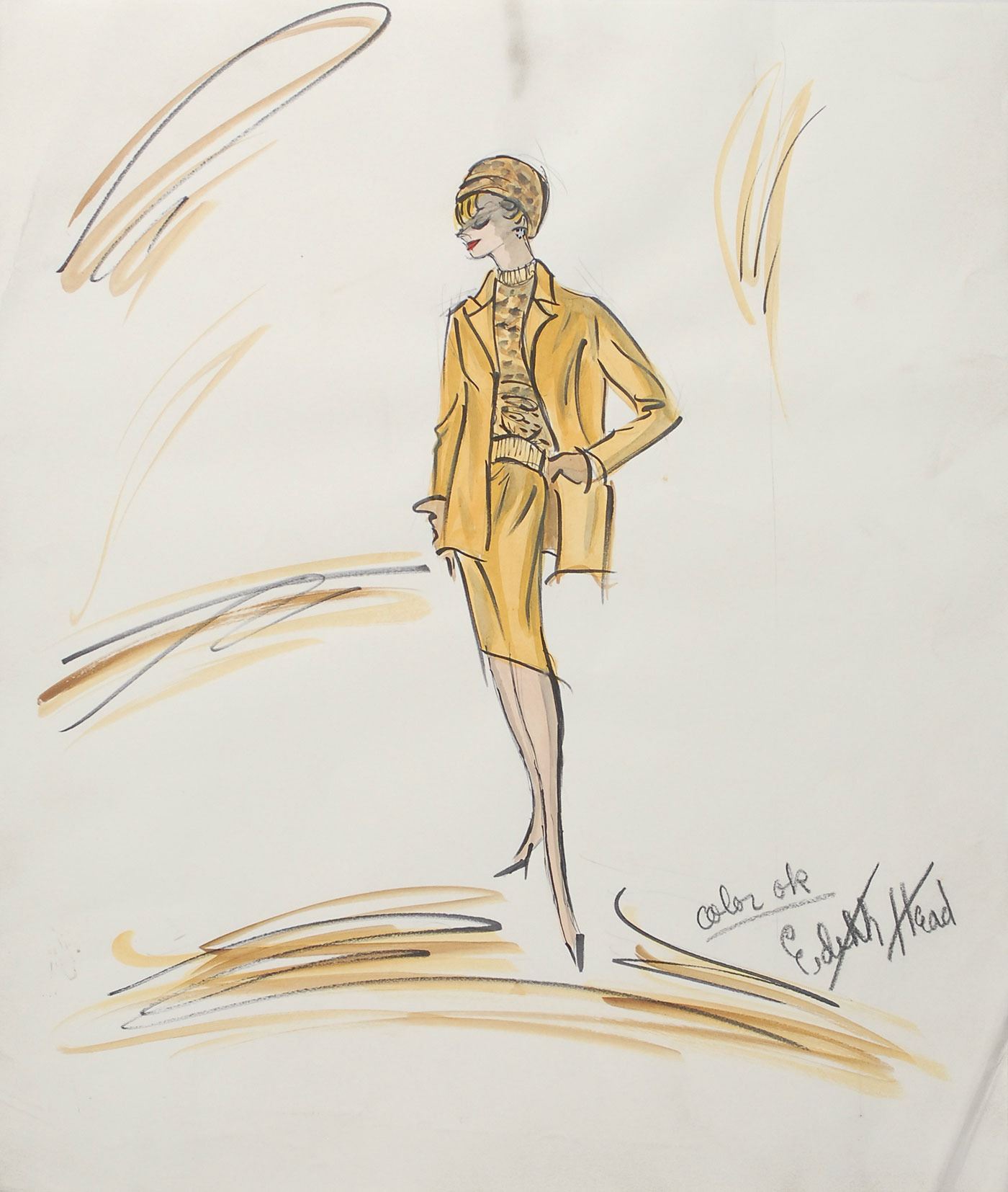 Two original costume sketches by Edith Head, accomplished in ink, graphite, and watercolor on individual off-white sheets, 14 x 16.5 and 13.25 x 17, with the first example being a color design signed and annotated in pencil, "color ok, Edith Head," and the second signed prominently in pencil Head, who includes multiple notations around the image. In overall fine condition, with expected light creases and handling wear.