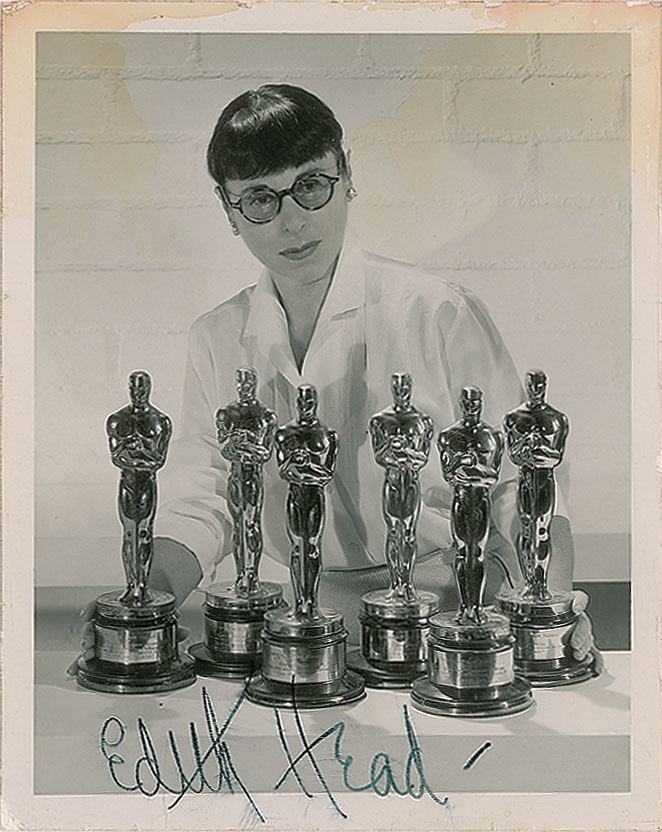 Vintage pearl-finish 4 x 5 photo of Edith Head posing with her six Academy Awards for Best Costume Design, signed in fountain pen. In very good to fine condition, with light staining at the top, and surface loss to the reverse causing some light rippling to the front. Head would win the award twice more—in 1961 for The Facts of Life and in 1974 for The Sting.