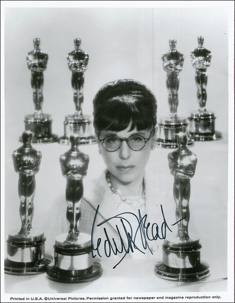 Glossy 8 x 10 Universal publicity photo of Head surrounded by her seven Academy Awards, signed in black felt tip. Scattered light surface impressions and bends, otherwise fine condition.