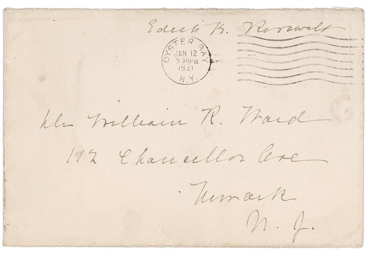 Free franked envelope, 6 x 4, addressed by Roosevelt to “Dr. Millian R. Ward, 112 Chancellor Ave, Newark, N. J.,” and franked in the upper right, “Edith K. Roosevelt.” Envelope also bears a January 12, 1921, Oyster Bay, New York postmark. In fine condition, with separated top edge and scattered light soiling.