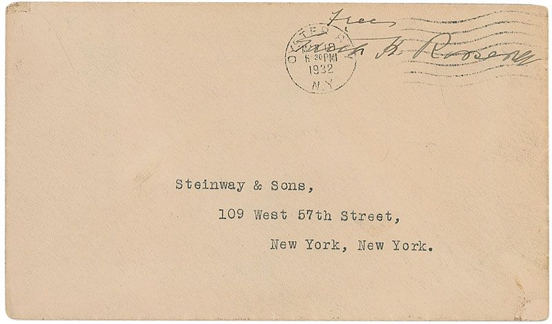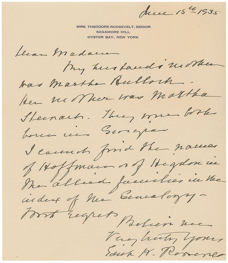 ALS, one page, 6 x 7, personal letterhead, June 15, 1935. Letter to an unidentified woman. In part: “My husband’s mother was Martha Bullock. Her mother was Martha Shenart. They were both born in Georgia.”; and a mailing envelope, 6.25 x 3.5, addressed in type to “Steinway & Sons,” postmarked May 18, 1932, and franked in the upper right, “Free, Edith K. Roosevelt.” In fine condition, with postal cancellation over franking signature and some light soiling to envelope.
