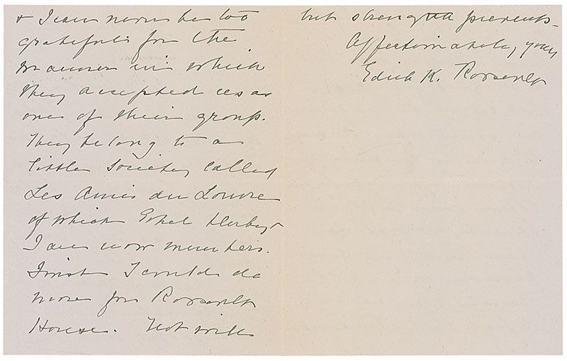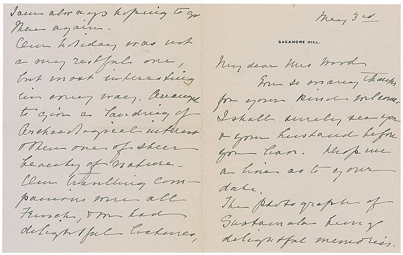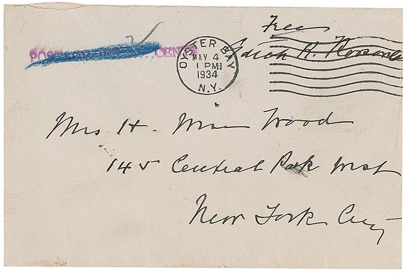 Second wife of President Theodore Roosevelt (1861–1948) and First Lady from 1901 to 1909. ALS, four pages on two adjoining sheets, 5.5 x 6.75, Sagamore Hill letterhead, May 3, 1934. Letter to a friend about various travels. In part: “Our holiday was not a very restful one, but most interesting in every way…Our traveling companions were all French, & we had delightful lectures.” In fine condition. Accompanied by the original mailing envelope, addressed in Roosevelt’s hand, with a franking signature, “Free, Edith K. Roosevelt,” to the upper right.