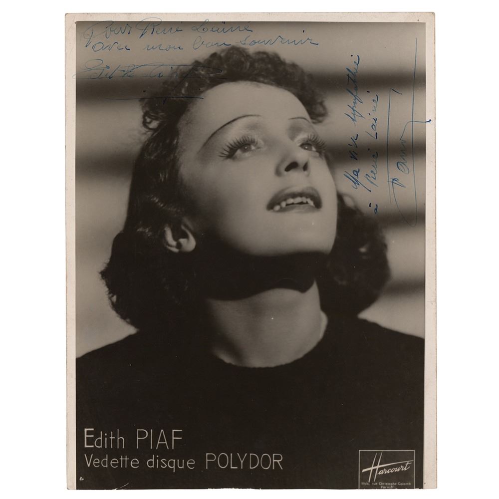 Attractive vintage pearl-finish 7 x 9 Polydor publicity photo of Piaf in an upward-facing pose by Studio Harcourt, signed and inscribed in French in blue ink, “Pour Rene Laine, avec mon bon souvenir, Edith Piaf.†An unknown has also signed the photo along the right side. In very good to fine condition, with tack holes to the corners, and a trimmed bottom edge.