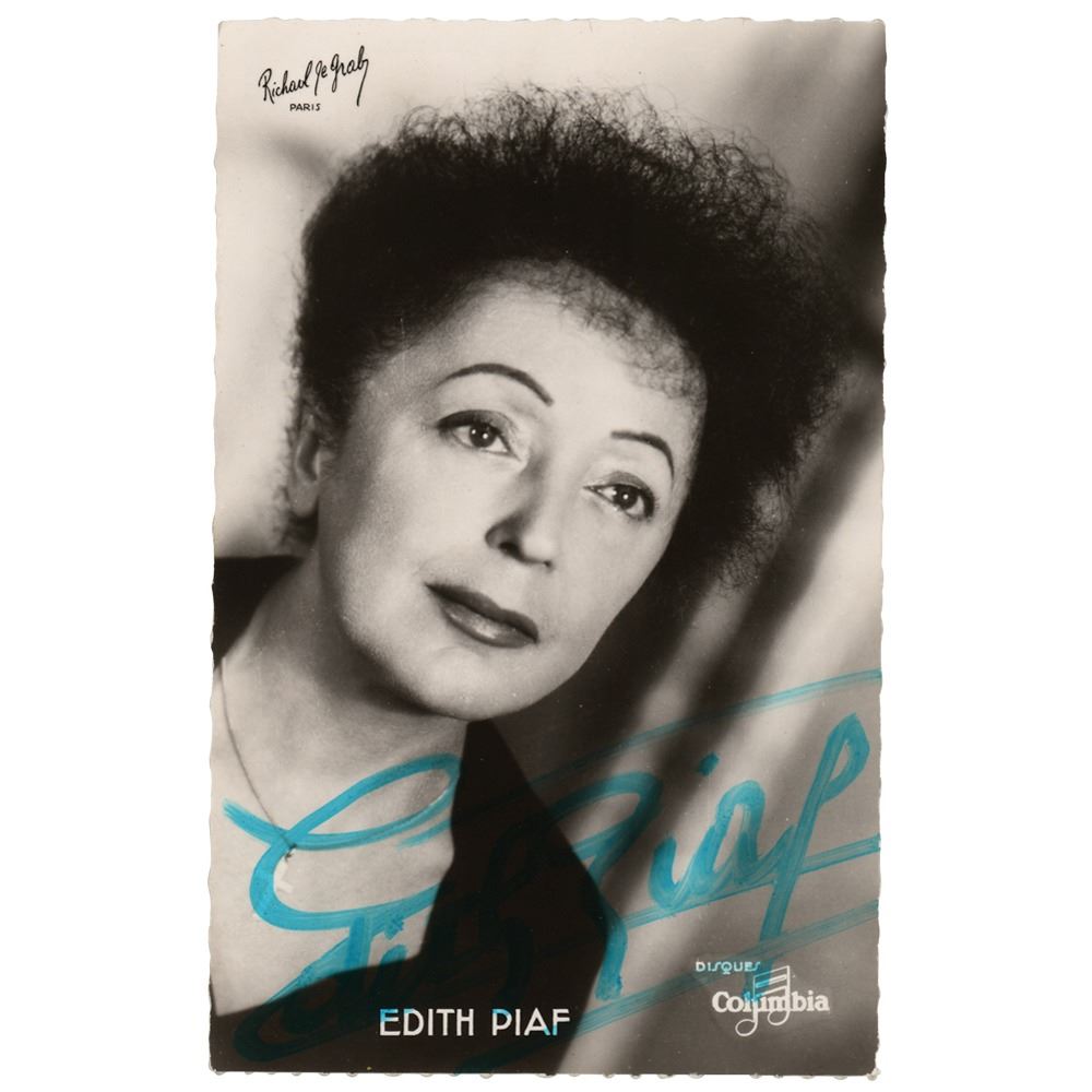 Vintage glossy 3.5 x 5.5 deckle-edge Columbia Records promo photo of Edit Piaf, prominently signed in thick blue felt tip. In very fine condition.