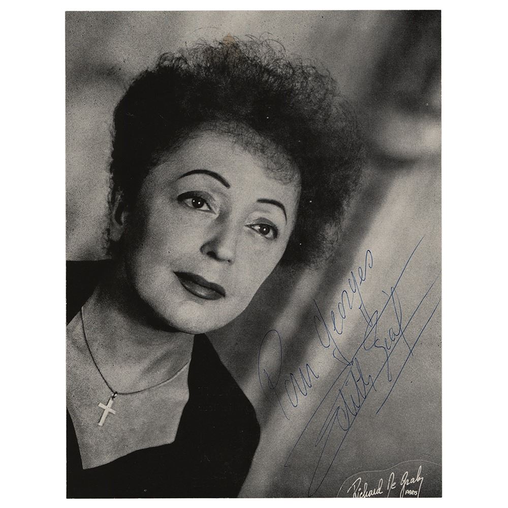 Attractive 6.5 x 8.5 magazine photo of Piaf by Richard De Graby of Paris, signed and inscribed in blue ballpoint, "Pour Georges, Edith Piaf.” Affixed to a same-size cardstock mount and in fine condition, with trimmed edges and toning from a piece of tape to reverse.