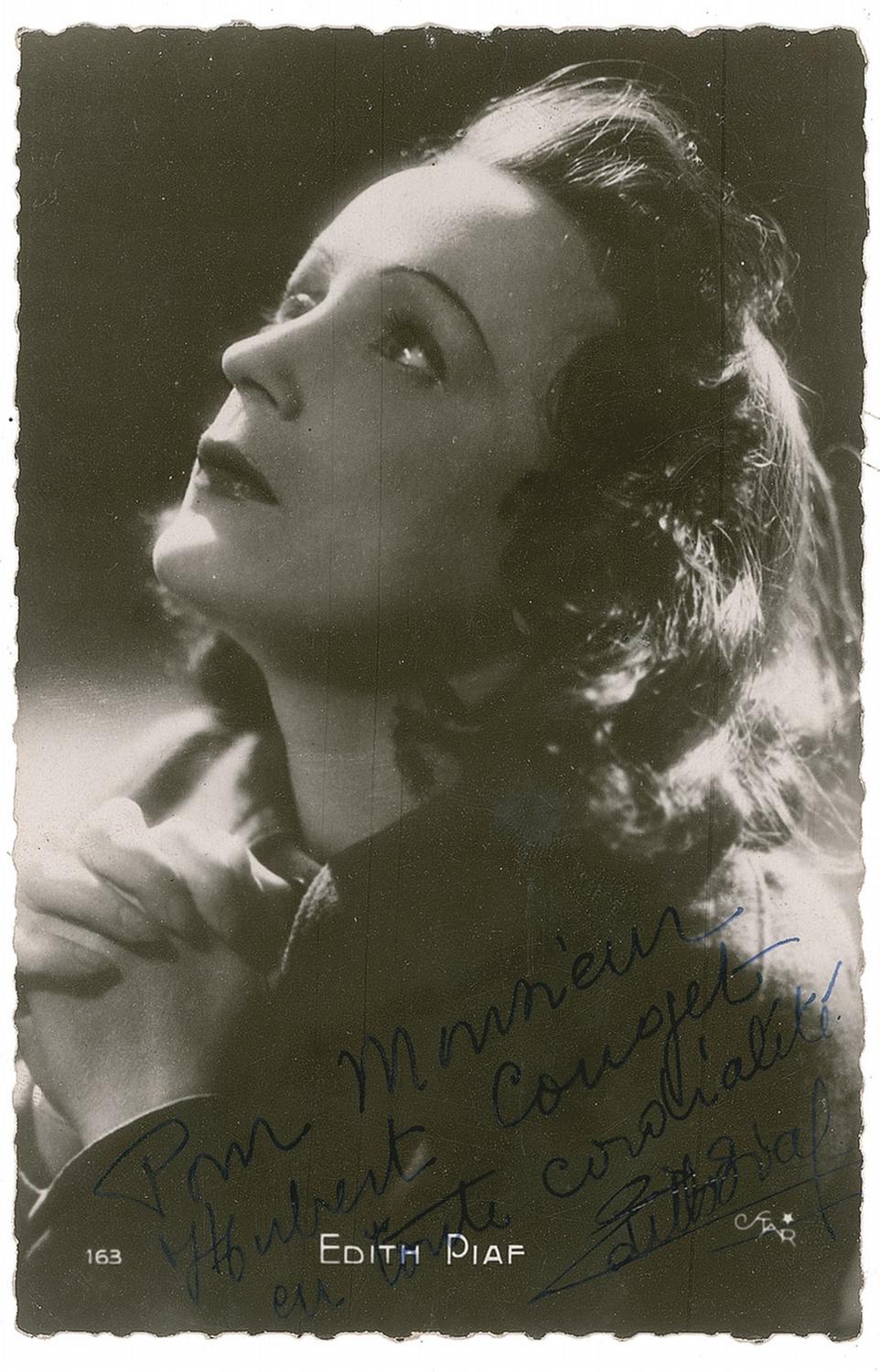 Vintage glossy 3.5 x 5.25 deckle-edge postcard photo, signed and inscribed in blue ink in French. In very good condition, with light silvering to darker areas, postal impressions along right edge, and scattered surface marks and rubbing to finish.