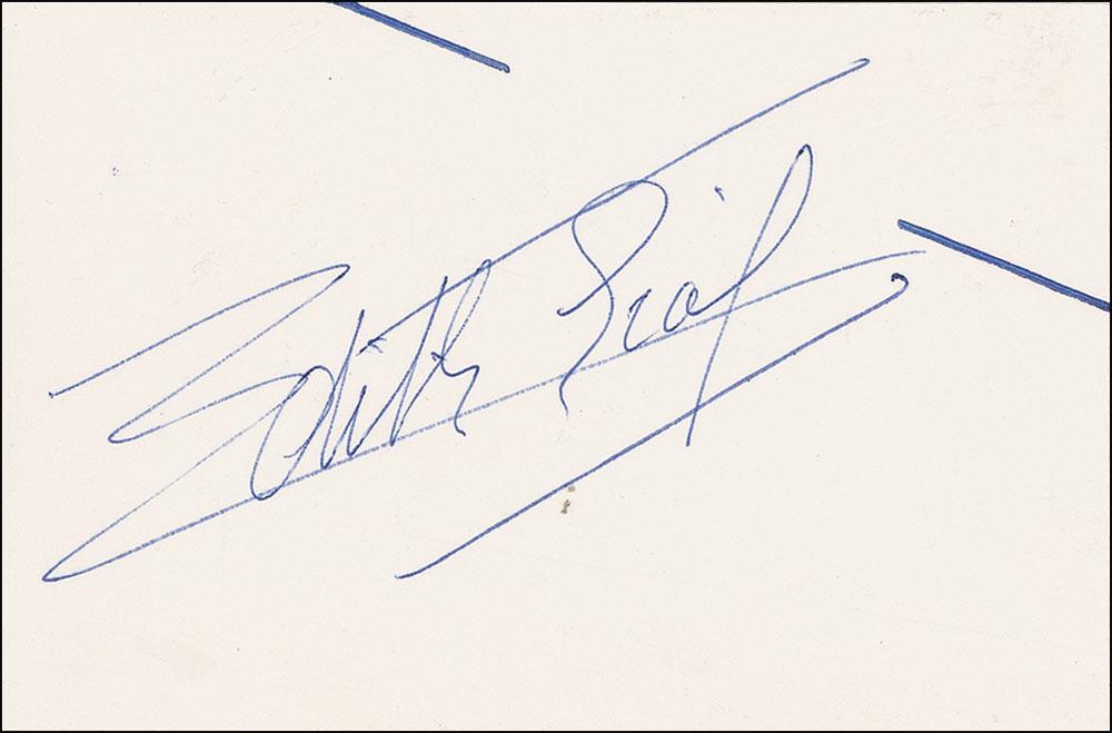 Distinctive French chanteuse (1915–1963), who attained worldwide popularity in the 1940s and 1950s and was revered as one of France’s cultural treasures. Vintage ballpoint signature, “Edith Piaf,” on an off-white 4 x 2.75 card. In fine condition, with single ink lines on either side of signature.