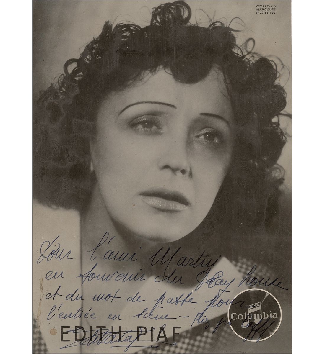 Distinctive French chanteuse (1915–1963), who attained worldwide popularity in the 1940s and 1950s and was revered as one of France’s cultural treasures. Vintage glossy 6.25 x 8.5 Columbia records publicity photo, signed and inscribed in blue ink in French. In very good condition, with scattered rubbing and spotting to finish, some light contrast to signature over Piaf’s printed name, a few fingerprints, and adhesive remnants to reverse.