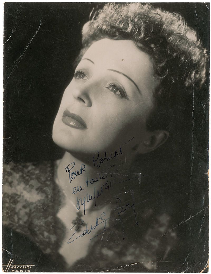 Distinctive French chanteuse (1915–1963), who attained worldwide popularity in the 1940s and 1950s and was revered as one of France’s cultural treasures. Vintage glossy 7 x 9 head-and-shoulders photo, signed and inscribed in fountain pen in French. In good condition, with trimmed edges, light contrast to portion of signature and inscription, and scattered noticeable creasing.