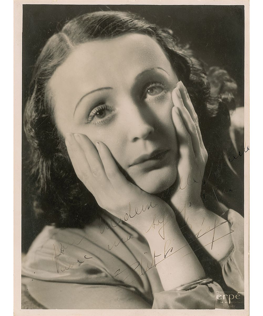 Gorgeous vintage pearl-finish 7 x 9.25 publicity photo of Piaf with her hands cradling her face, signed and inscribed in French in fountain pen, “Pour Mademoiselle Marcelle, toute ma sympathie, Edith Piaf.” Light silvering to dark areas of the image, and the inscription and signature light but legible, otherwise fine condition.