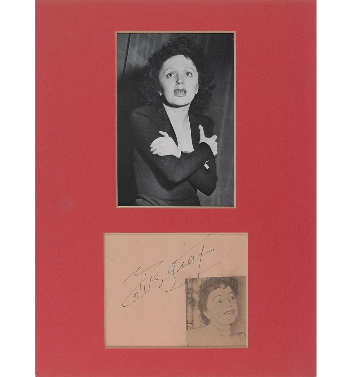 Vintage ink signature, “Edith Piaf,” on an off-white album page with a clipped photo of Piaf affixed to the lower right corner. Matted with a photo of Piaf to an overall size of 9 x 12. In fine condition.