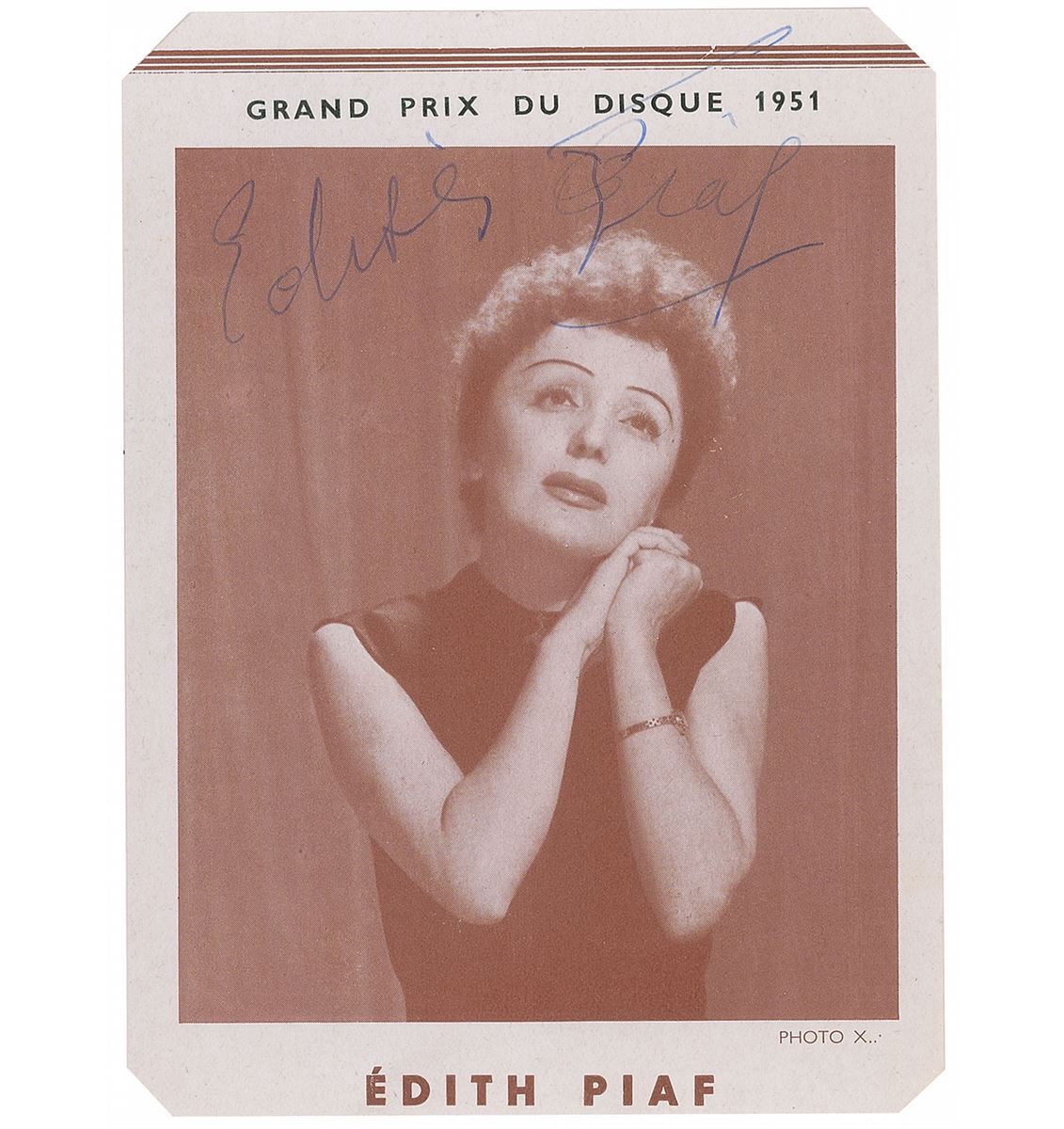 Attractive 4 x 5.5 photo of Piaf clipped from a Grand Prix du Disque program from 1951, signed in blue ink. In fine condition, with clipped corners and portions of the last name a shade light.