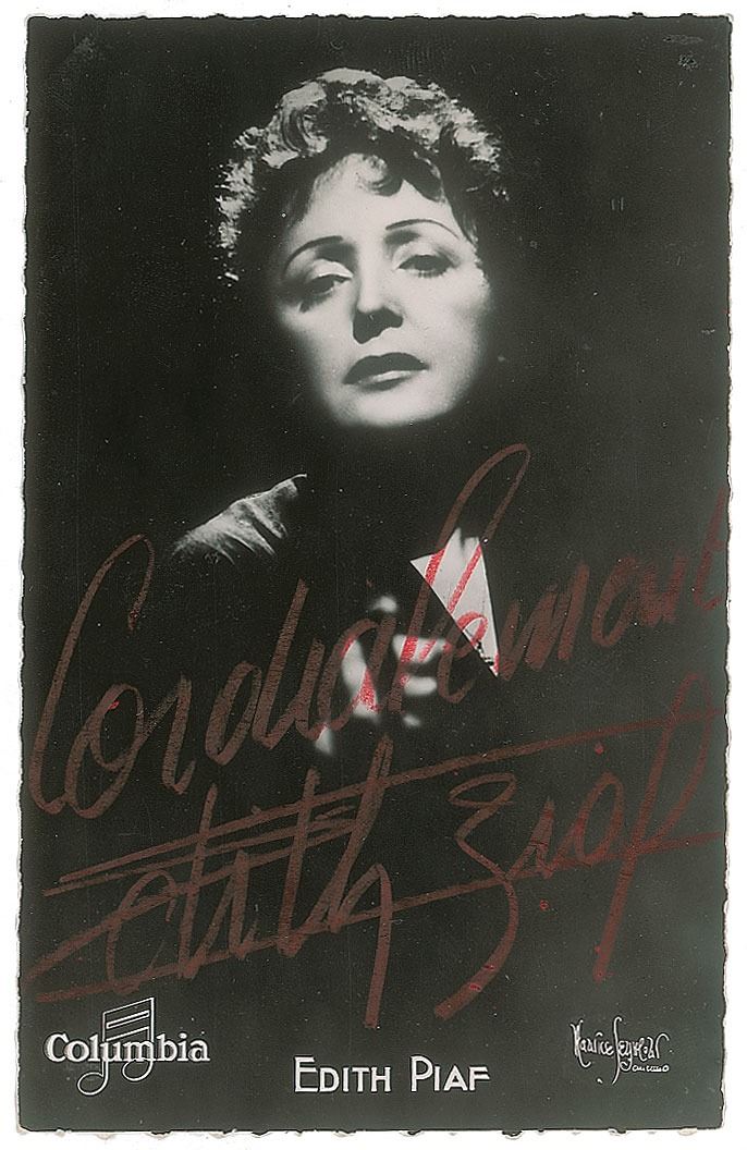 Vintage glossy 3.5 x 5.5 Columbia Records publicity photo of Edith Piaf by the Maurice Seymour Studio, signed and inscribed in red grease pencil, "Cordialement, Edith Piaf.” In fine condition, with moderate signature contrast.
