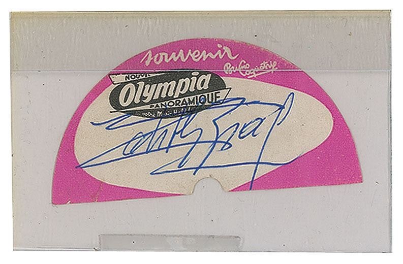 Sought-after ballpoint signature, "Edith Piaf,” on a pink-and-white 3 x 1.5 souvenir record sticker from "Le Nouvel Olympia Panoramique…votre Music-Hall!" In fine condition.