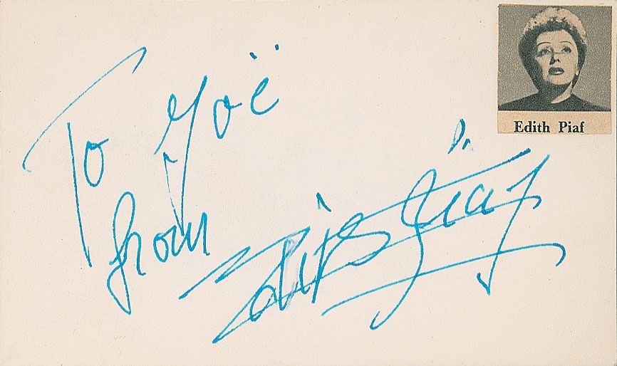 Vintage fountain pen signature and inscription, "To Joe, from Edith Piaf,” on an off-white 5 x 3 card bearing a small affixed portrait. Notation on the reverse dates the signature to December 3, 1955. In very fine condition. Originally obtained in person by a New York autograph collector who collected from the 1950s through the 2000s.