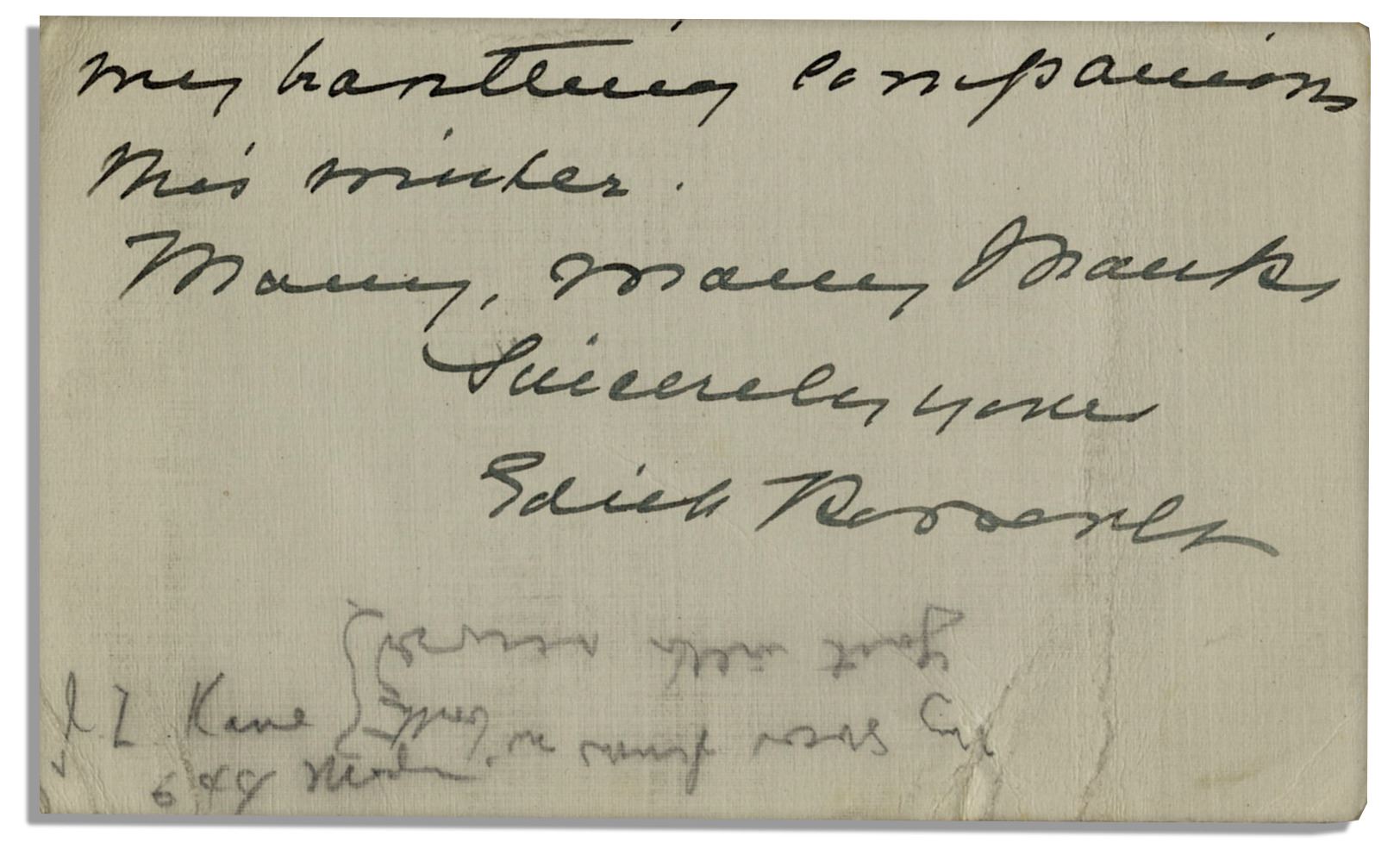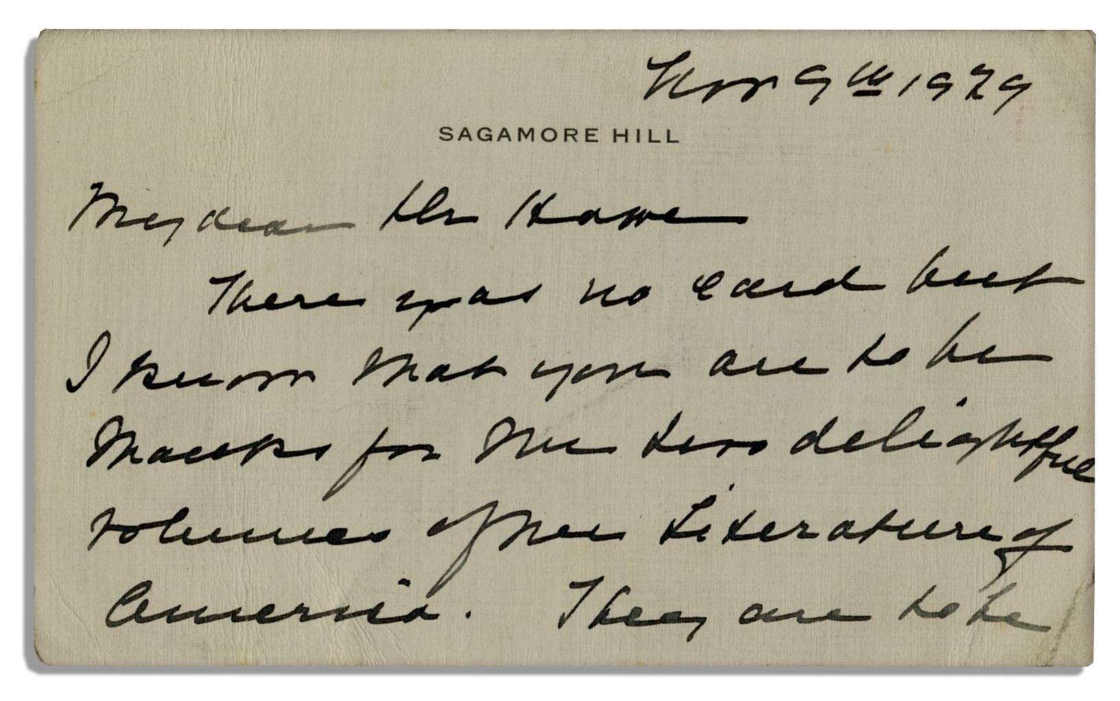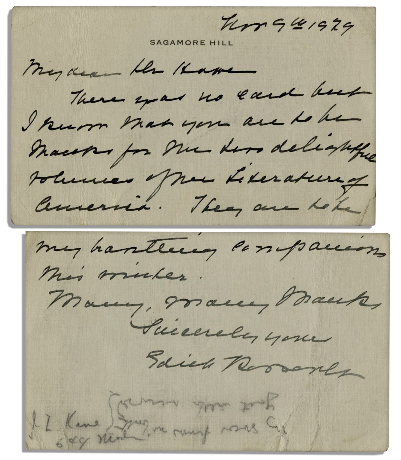 Edith Roosevelt autograph note signed on Sagamore Hill stationery, where the Presidential couple lived for most of their lives. Dated 9 November 1929, note is addressed to William David Howe, Charles Scribner's Sons editor, thanking him for a set of volumes on American literature that are to be her ''...bantering companions this winter.'' 2pp. note on front and verso of card is written in black ink and is signed ''Edith Roosevelt''. With a pencil notation in an unknown hand beneath signature. Measures 5.25'' x 3''. Creasing to corners and minor toning. Very good.