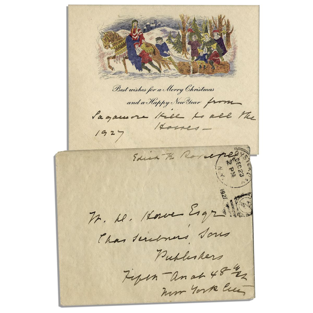 Edith Roosevelt 1927 Christmas Card, dated 1927 with no signature but with a handwritten note. Original envelope postmarked 23 December included is however signed at top, ''Edith Roosevelt'' and is addressed in her hand to Charles Scribner's Sons editor Will David Howe. Christmas card depicts a festive winter scene and printed script reads, ''Best wishes for a Merry Christmas and a Happy New Year'' with a note in the former First Lady's hand, ''from / Sagamore Hill to all the Howes / 1927''. Both card and envelope measure 5'' x 4'' with minor toning, else very good condition.