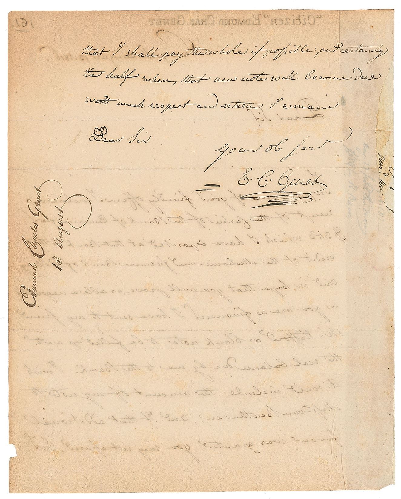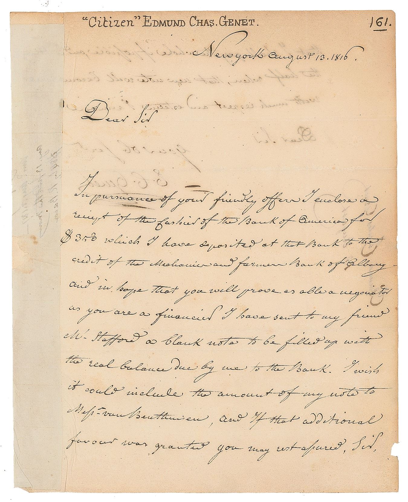 ALS signed “E. C. Genet,” one page on two adjoining sheets, 7.75 x 9.75, August 13, 1816. In part: "In pursuance of your friendly offer I enclose a receipt of the Cashier of the Bank of America…which I have deposited at that Bank to the credit of the Mechanic and farmer Bank of Albany and in hope that you will prove as able a negotiator as you are a financier I have sent to my friend M. Stafford a blank note to be filled up with the real balance due by me to the Bank. I wish it could include the amount of my note to Mess'r van Beuthuisen, and if that additional favour was granted you may rest assured, Sir, that I shall pay the whole if possible, and certainly the half when, that new note will become due with much respect and esteem." In very good to fine condition, with light creasing, and a small chip to the right edge.