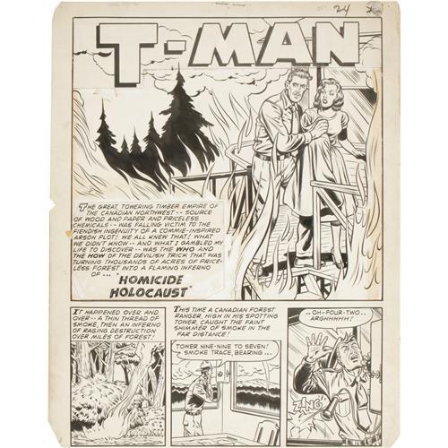<B>Edmond Good (attributed)</B></I> - <B>T-Man, Title Page 1 Original Art (Quality, circa 1952).</B></I> It's a hot time in the forest for T-man, Pete Trask, in this sizzling title page for "Homicide Holocaust." With a gorgeous "good girl" opening scene, this fabulous fifties thriller will make an awesome addition to any Quality art collector's portfolio. This rip-snorter has an image area of 13" x 18", and is in Very Good condition.<BR><BR><b>Shipping:</b> Flat Material, Large (<a target="_blank" href="http://www.heritageauctions.com/common/shipping.php">view shipping information</a>)
