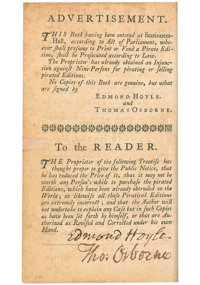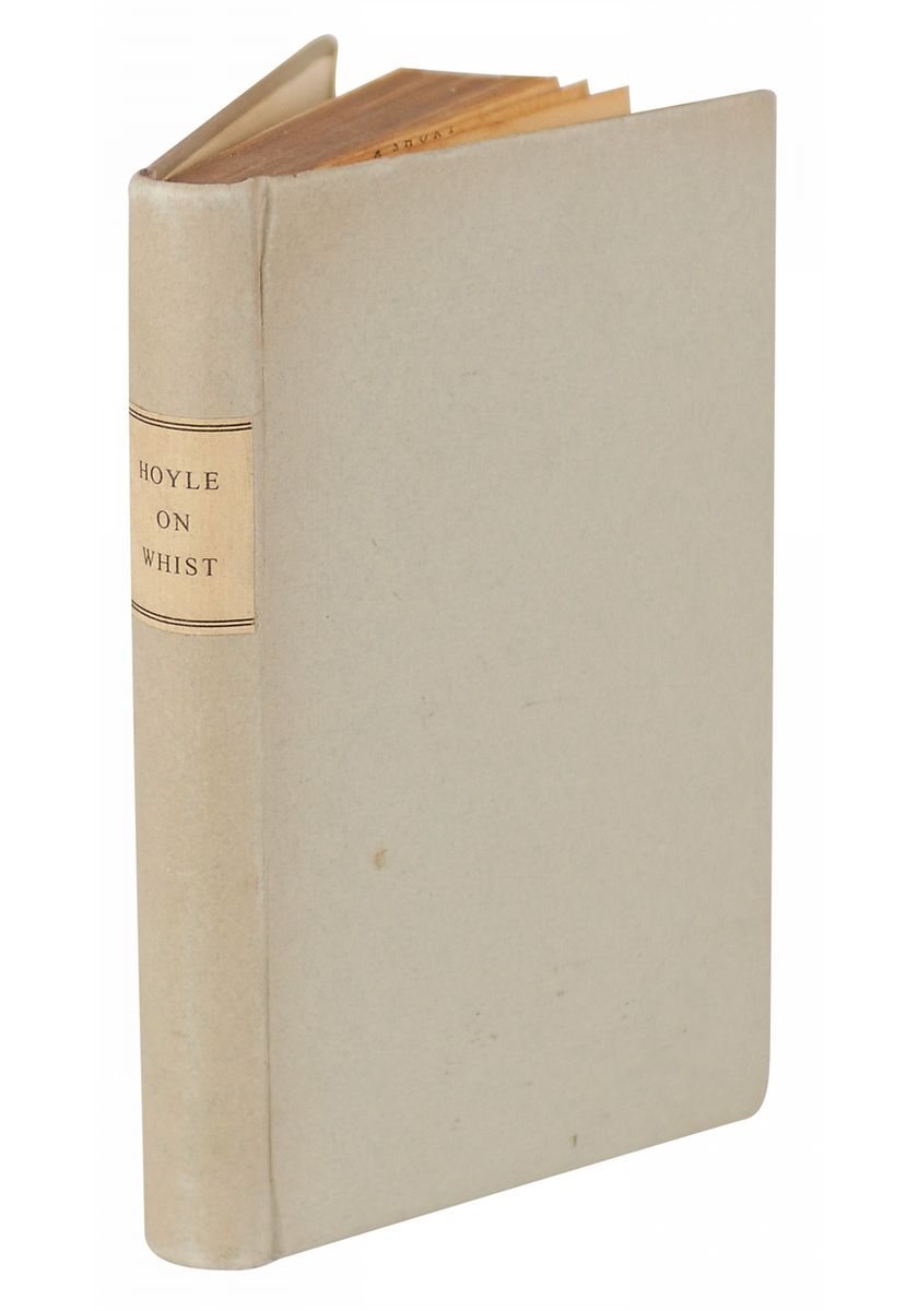 British writer (1672–1769) whose best-selling codifications of the rules for the most popular card games of his day led to the familiar authoritative phrase ‘according to Hoyle.’ Signed book: Hoyle on Whist. Later printing. London: Thomas Osborne, 1750. Professionally rebound hardcover, 4 x 6.25, 224 pages. Signed in black ink on an inside page under a printed message to the reader which reads, in part: “The Proprietor of the following Treatise has thought proper to give public notice, that he has reduced the price of it, that it may not be worth any Persons while to purchase the Pirated Editions, which have already been obtruded on the World.” Also signed by Thomas Osborne. Book description: VG-/None. Rebound in pale blue paper-covered boards; textblock unevenly trimmed, with top line on title-page partially removed. Gentle bumps to upper corners of boards; slightly rubbed and soiled; textblock yellowed with light scattered foxing throughout; small piece of archival tape to fore-edge of title-page.