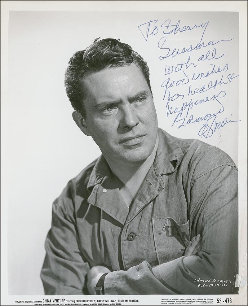 Actor (1915-1985) best remembered for his roles in D.O.A. and White Heat. Vintage glossy 8 x 10 Columbia Pictures promotional photo for China Venture, signed and inscribed in blue ballpoint “To Sherry Sussman, with all good wishes for health & happiness, Edmond O’Brien.” Creasing to lower right corner, and scattered light surface marks and impressions, otherwise fine condition.