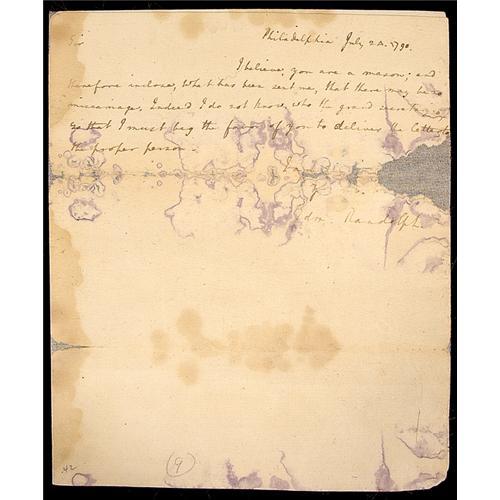 <Our item number 141110><B>Randolph, Edmond.</B> (1753-1813) Governor of Virginia, Secretary of State, and the first United States Attorney General. Autograph letter signed ("Edm Randolph"), Philadelphia, July 24, 1790. 9 x 7½ in. <BR>"Sir, I believe you are a mason; and therefore inclose, what has been sent me, that there may be no miscarriage. Indeed I do not know who the grand secretary is, so that I must beg the favor of you to deliver the letter to the proper person-…" Stained, silked and age toned. <BR>Estimated Value $150 - 200. <BR><BR>Our item number 141110<BR><IMAGES><P ALIGN="CENTER"><IMG SRC="http://www.goldbergcoins.net/liveauction/49jpegs/141110.jpg"> </P></IMAGES>