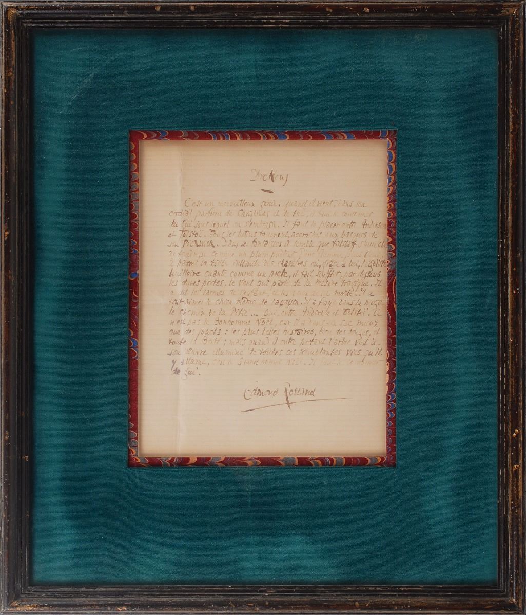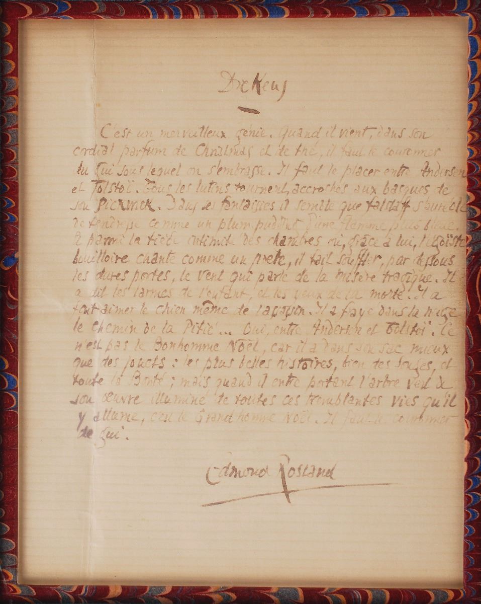 Handwritten testimonial in French, one page, lightly-lined, 6.5 x 8.5, no date. A letter, headed “Dickens,” in full (translated): “He is a marvelous genius. When he comes, with his cordial perfume of Christmas and Tea, he must be crowned with the mistletoe under which people kiss one another. He must be placed between Andersen and Tolstoy. All imps roam about, hanging onto the coattails of his Pickwick. In his fantasies, it seems that Falstaff is aureoled with tenderness, like a plum pudding with a bluer flame. And in the midst of the warm intimacy of rooms where, thanks to him, the selfish kettle sings like a poet, he causes the wind which speaks of tragic misery to blow beneath the hard doors. He told of the child’s tears, and the eyes of death. He broke Pity’s path through the snow—Yes, between Andersen and Tolstoy. He isn’t Father Christmas, because in his sack he has something better than toys: the most beautiful stories, many dreams, and all goodness; but when he enters bearing the green tree of his work, illuminated by all those flickering lives he lights there, he is noble Christmas. He must be crowned with mistletoe.” Double-cloth-matted and framed to an overall size of 14 x 16.25. In fine condition. Redolent of the warmth and charm of a Dickensian tale, this delightful letter offers glowing praise of the influential English author, whom Rostand bookends between two of literature’s foremost names. Given the French playwright’s expertise in crafting memorable characters for the stage, Rostand’s rich acclaim denotes the impact Dickens must have had on him as a burgeoning writer.