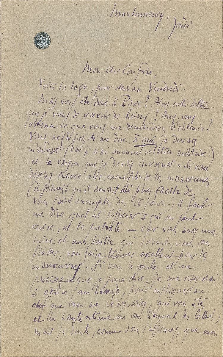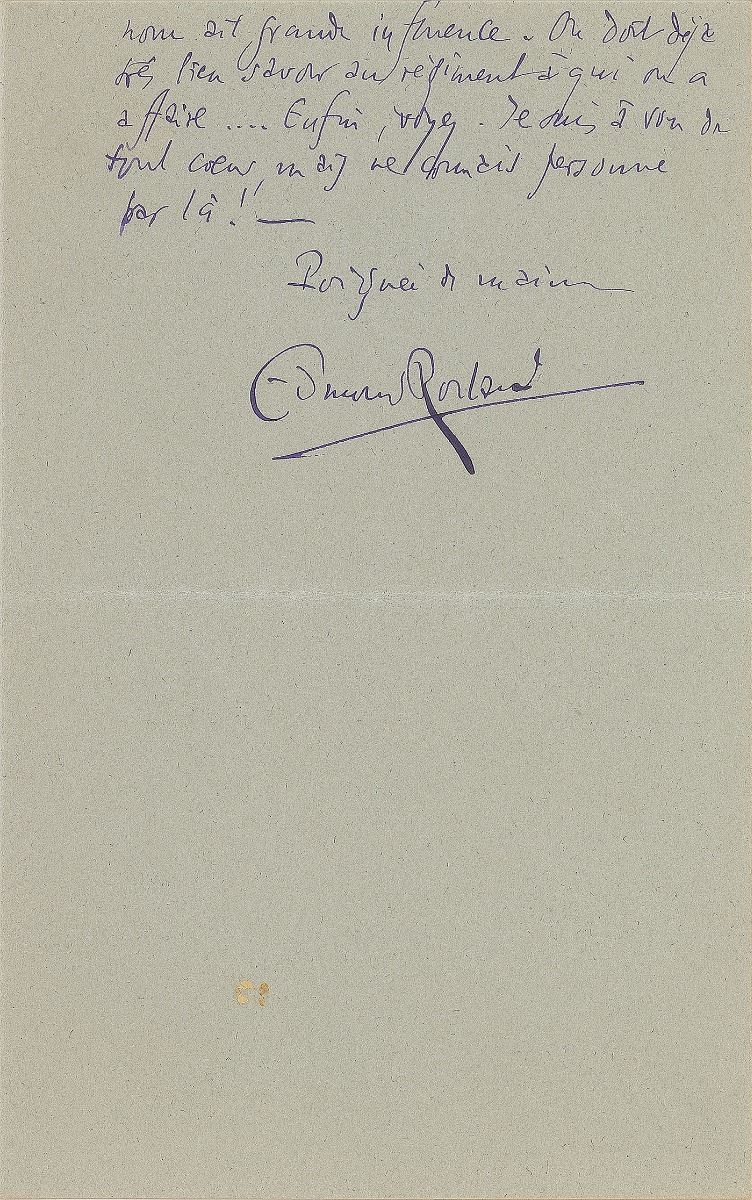 French poet and dramatist (1868–1918) best known for his play Cyrano de Bergerac. ALS in French, two pages on two adjoining sheets, 3.75 x 6, no date. Letter to a colleague, in part (translated): "Here is the [theatre] box for tomorrow, Friday. Are you indeed in Paris?…Did you get what you were asking for? You neglected to tell me who I should talk to (because I have no connection at all in the military), and the reason I should invoke. If you still want to be exempted from those exercises (I am told it would have been easy to get you an exemption for the 28 days), I must be told what officer I should write to, and what pretext to use—because your size and physical appearance must make you, without any attempt at flattery, an excellent candidate…If you want and can tell me what I should say, I will take a chance and write to the chief…to explain who you are and the high esteem in which you are held by the world of literature.” In fine condition.