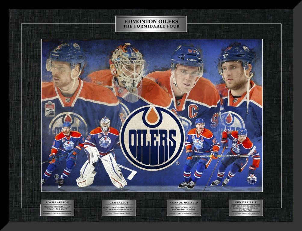 This piece includes images of Adam Larsson, Cam Talbot, Connor McDavid and Leon Draisaitl. Dimensions are 36" W by 32" H