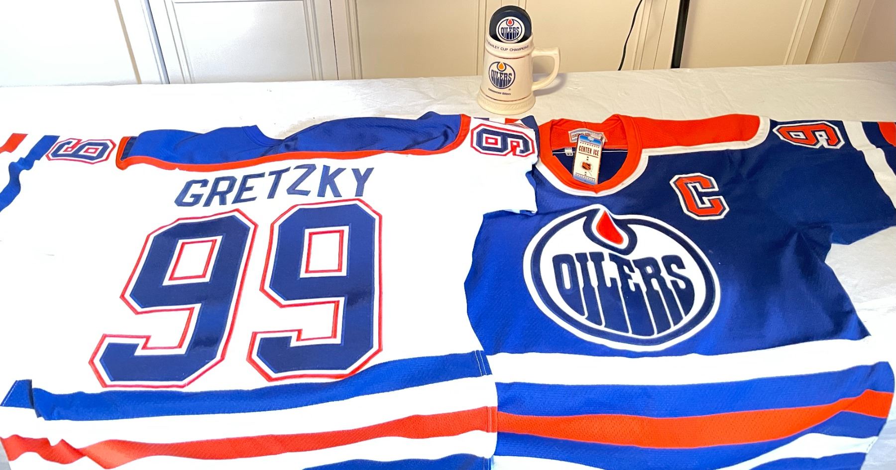 Edmonton Oilers Lot includes 2 brand new home and away Edmonton Oilers Wayne Gretzky jerseys - still have the tags - size 42. Oilers hat, toque, mug and puck.