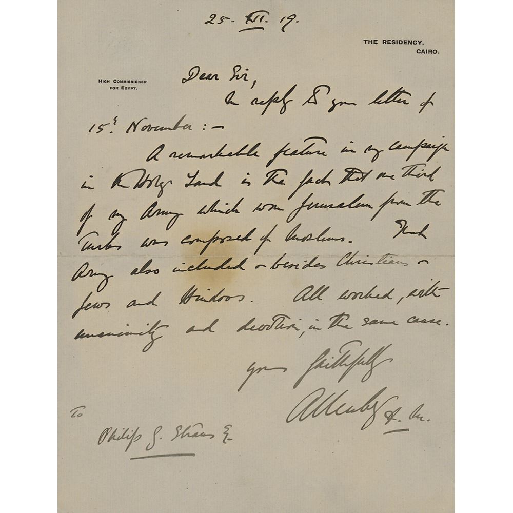 A superb letter with commentary on the diversity of his troops, who worked together to preserve the cultural and religious integrity of Jerusalem upon its capture. When Allenby defeated the Turks and began his occupation, he issued a proclamation promising 'that every sacred building, monument, holy spot, shrine, traditional site, endowment, pious bequest, or customary place of prayer of whatsoever form of the three religions will be maintained and protected according to the existing customs and beliefs of those to whose faith they are sacred.'