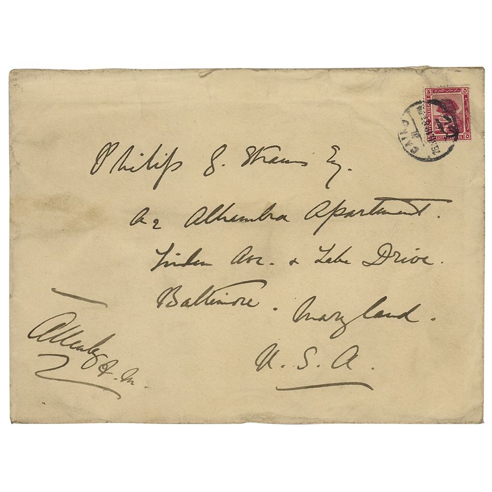 British soldier and administrator (1861-1936) most famous for his role during World War I, in which he led the Egyptian Expeditionary Force in the conquest of Palestine and Syria in 1917 and 1918. ALS signed “Allenby F.M.,” one page, 7.5 x 9.75, The Residency, Cairo letterhead, December 25, 1919. Significant handwritten letter penned shortly after the conclusion of World War I, in part: "A remarkable feature of my campaign in the Holy Land is the fact that one third of my Army which won Jerusalem from the Turks was composed of Muslims. That Army also included—besides Christians—Jews and Hindoos. All worked, with sincerity and devotion, in the same cause." In fine condition, with a small circular area of toning. Accompanied by the original hand-addressed mailing envelope, also signed by Allenby and retaining its wax seal on the reverse.